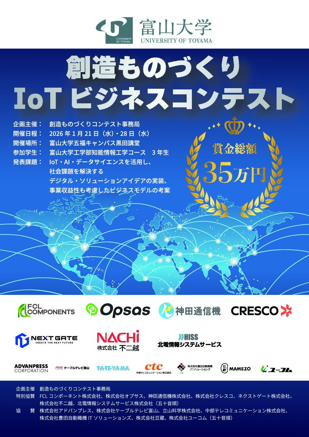 株式会社オプサスは2026年1月に富山大学工学部 工学科 知能情報工学コースにて実施される「創造ものづくりIoTビジネスコンテスト」へ協賛いたします。
